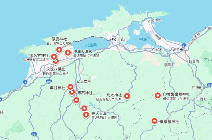 しかし、神社の祭神分布や伝承からすると、日野川の上流域から西に折れ、奥出雲に入り、旧飯石郡内から南下、斐伊川沿いを下ったと考えられています。