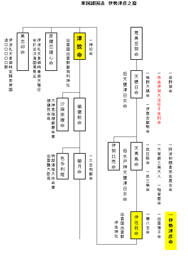 しかし、そもそも伊佐我命の亦の名に伊勢津彦命もあり、(※系図の伊佐神社は、「伊佐波神社」の間違いです。)見ようによっては、八束水臣津野命系の神々が紛れ込んでいるとも考えられます。(ちなみに7代目の出雲色多利姫は、出雲口伝によると事代主命系だそうです。)